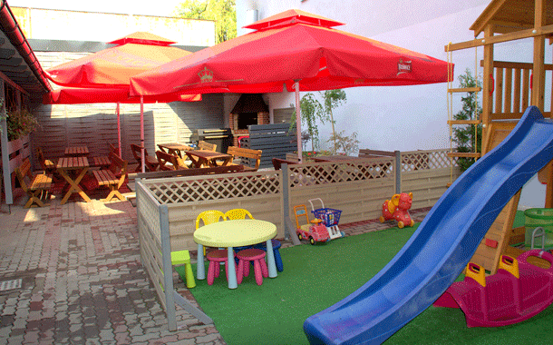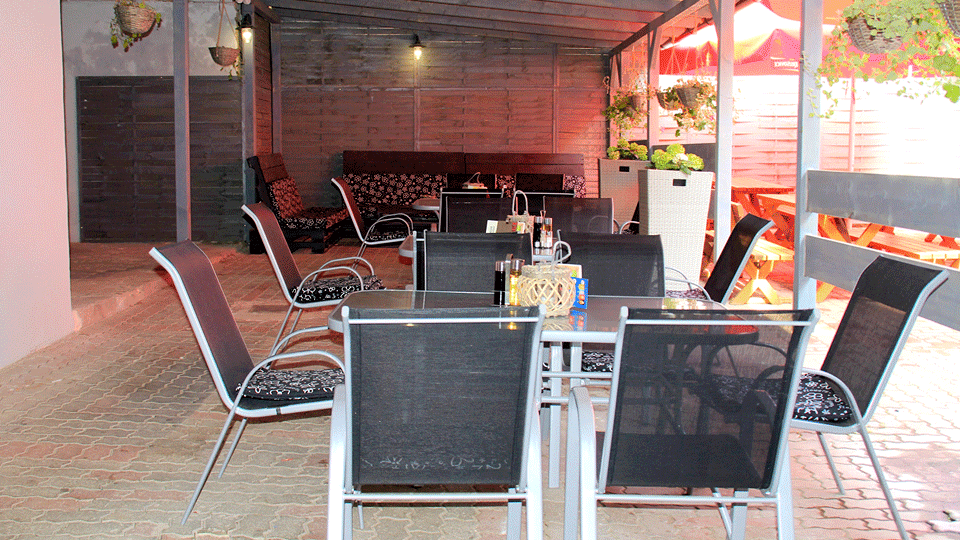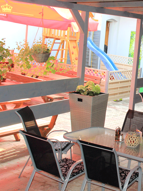 Terasa se zastřešeným i nezastřešeným sezením, dětským koutkem a venkovním grilem.Terasa je s obsluhou a v sezoně se zde grilují jídla podle sezonní nabídky. Terasa slouží celoročně i jako místo pro kouření.